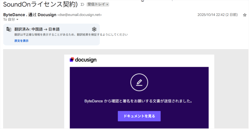 登録したメールアドレスにDocusignから契約書が送られてきます。中国語なので、上部に表示される日本語への翻訳するボタンで翻訳します。