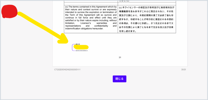 契約書は結構長くて読むのが嫌になりますが、一応内容をよく確認し、画面の指示に従って上の方法で署名し、「完了」ボタンを押します。