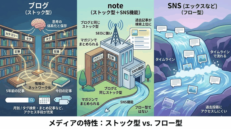 noteは、SNS機能があるとはいえ、ブログと同じストック型のプラットフォームです。