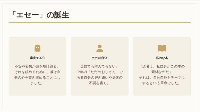 ところがモンテーニュが書いたのは、英雄でも聖人でもない、ただの中年のおじさんの話です。
